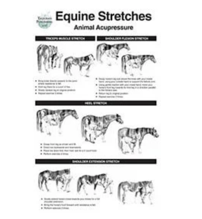 The Equine Stretch Poster gives you a visual of 10 excellent stretches to do with your horse. These stretches, well within your horses’ range-of-motion, will help keep him supple and strong. In addition, they help to open your horse’s meridians, and improve flexibility and strength, Regular interaction such as stretching can also help you to develop an even stronger relationship between you and your horse.